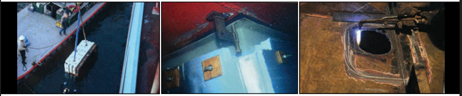 Underwater hull insert repairs are conducted in a similar fashion, involving the use of a large cofferdam and the welding of a certified steel plate into place by qualified personnel. The welds are then ground smooth and inspected by the U.S. Coast Guard and the attending Class Surveyors. Like other methods mentioned, this repair is also considered temporary and typically results in the issuance of a Condition of Class (COC) by the vessel’s classification society.
